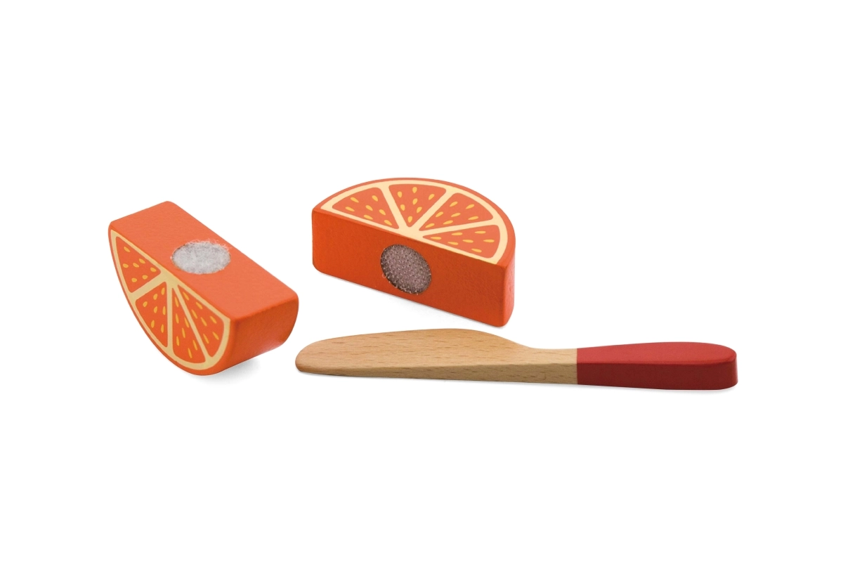 Este juego de madera de alta calidad ofrece un juego de cocina seguro: las piezas de fruta están unidas con velcro, lo que permite a los niños “cortarlas” y volver a unirlas repetidamente. Gracias a su diseño realista, los niños aprenden a reconocer formas y colores, practican el agarre y la coordinación y desarrollan la imaginación jugando a ser cocineros.