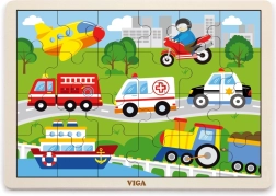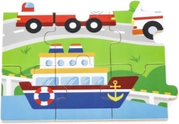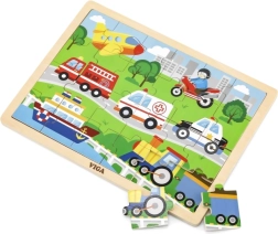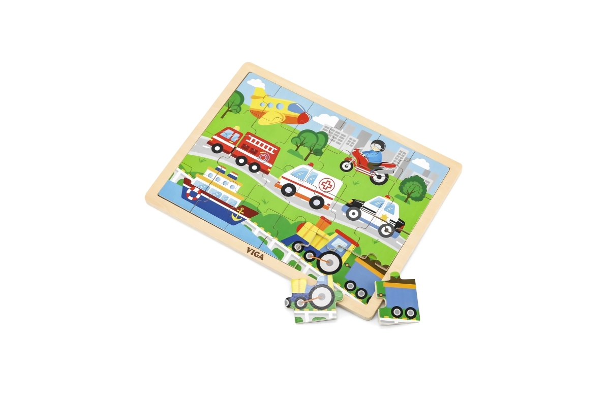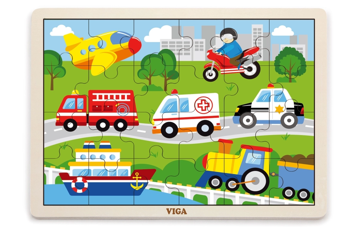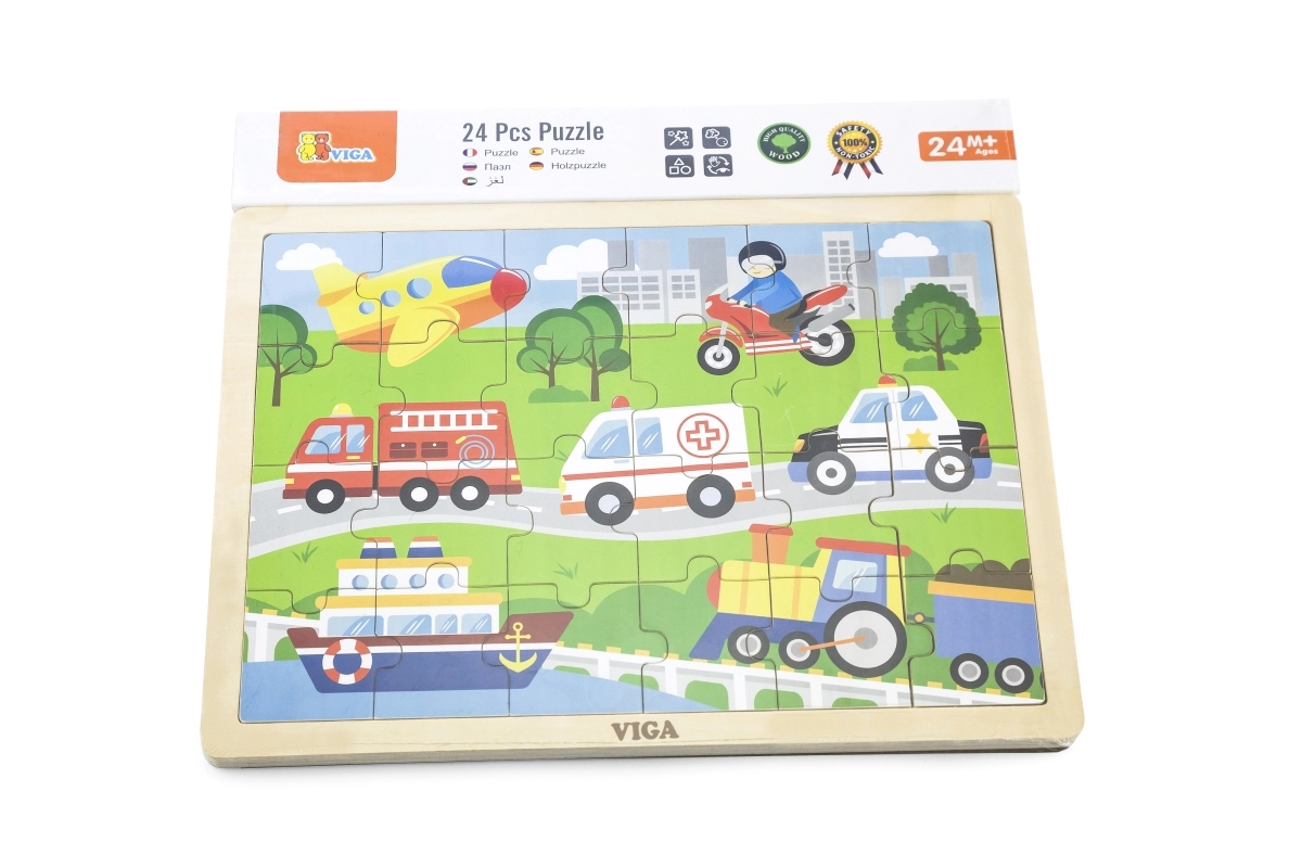 Este rompecabezas de madera con imágenes de medios de transporte es una gran elección para un primer puzzle “más grande”. Gracias a sus 24 piezas, el montaje supone el desafío justo: fomenta la concentración y la satisfacción de completar una imagen de aproximadamente 27,5 × 20 cm. Las ilustraciones coloridas de vehículos (ambulancia, camión de bomberos, coche de policía, barco, avión, etc.) motivan a los niños de forma natural a jugar una y otra vez.