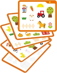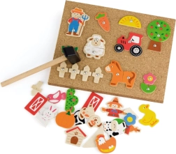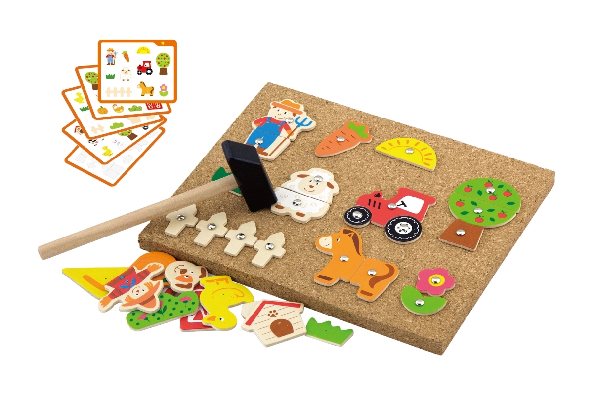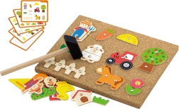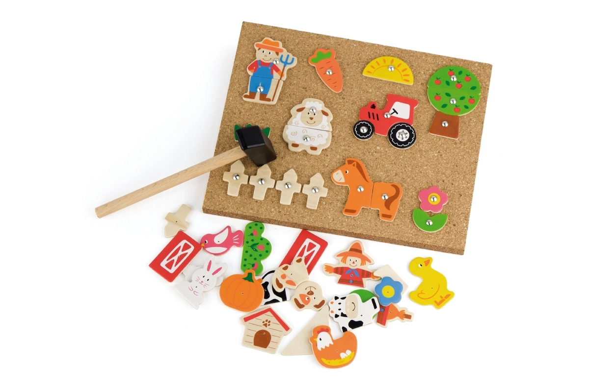 Las coloridas formas de madera se fijan con chinchetas a la resistente tabla de corcho: los niños componen animales, un tractor y un granjero según su imaginación.