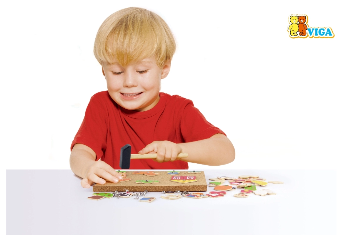 Clavar las piezas con el martillo entrena la coordinación mano-ojo, la concentración y el razonamiento lógico siguiendo principios Montessori.