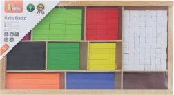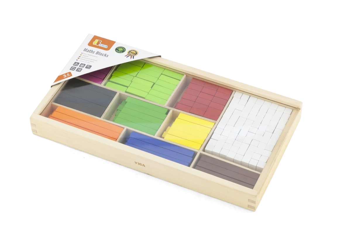 El set incluye 308 regletas de madera en 10 longitudes y colores estándar, guardadas en una resistente caja con compartimentos. Es ideal para el aprendizaje en casa y la enseñanza escolar, tanto para trabajo individual como para actividades en grupo.