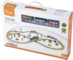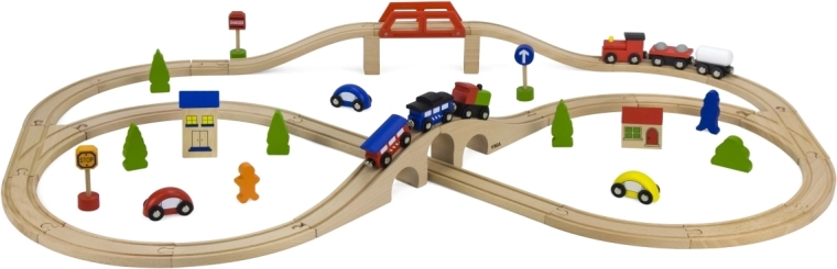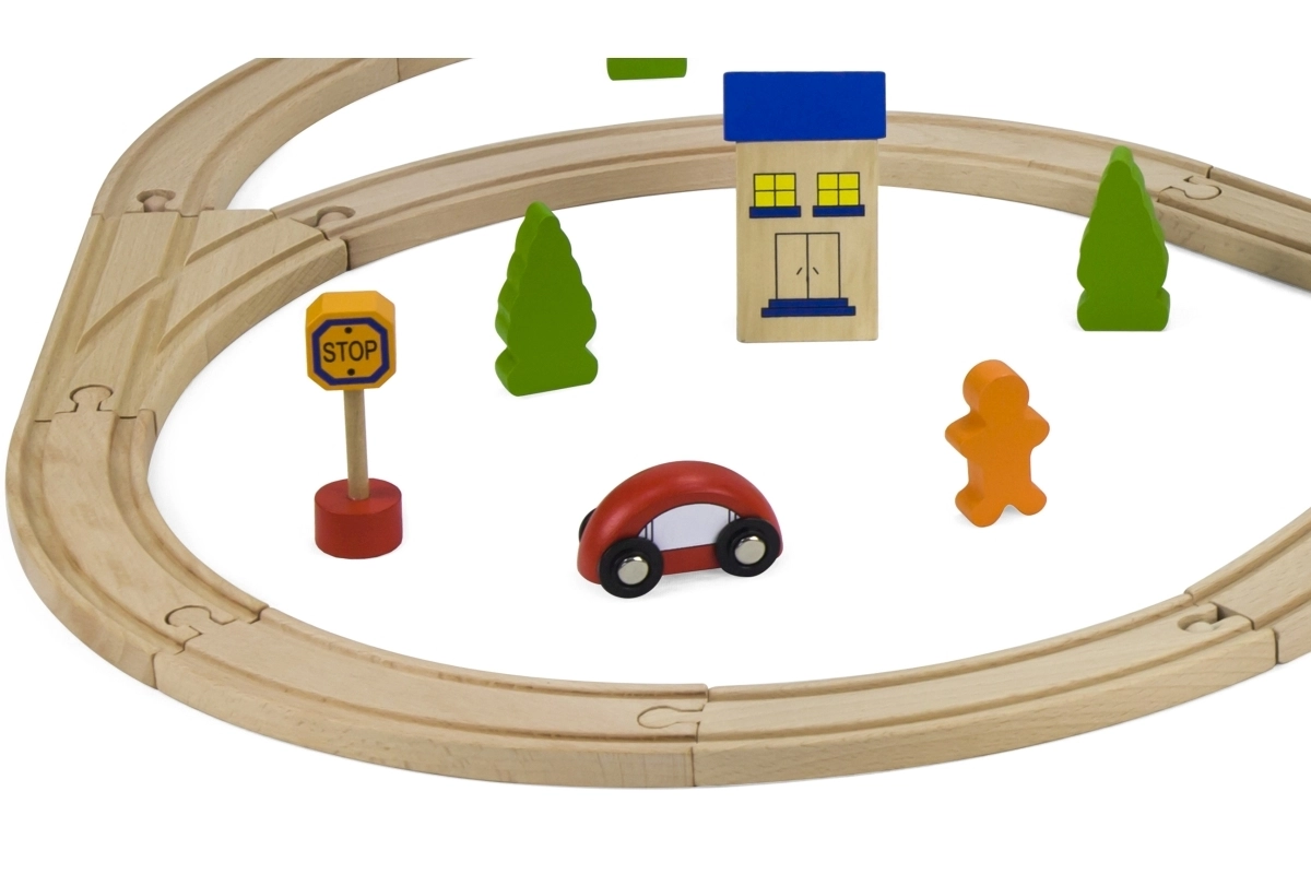 ¡Construye tu propio mundo sobre rieles! La pista de tren de madera, con su longitud total y disposición de vías, permite a los niños crear recorridos variados, superar puentes y conectar el transporte con la ciudad gracias a los cochecitos y accesorios incluidos. La elaboración en madera de calidad es duradera y agradable al agarre.