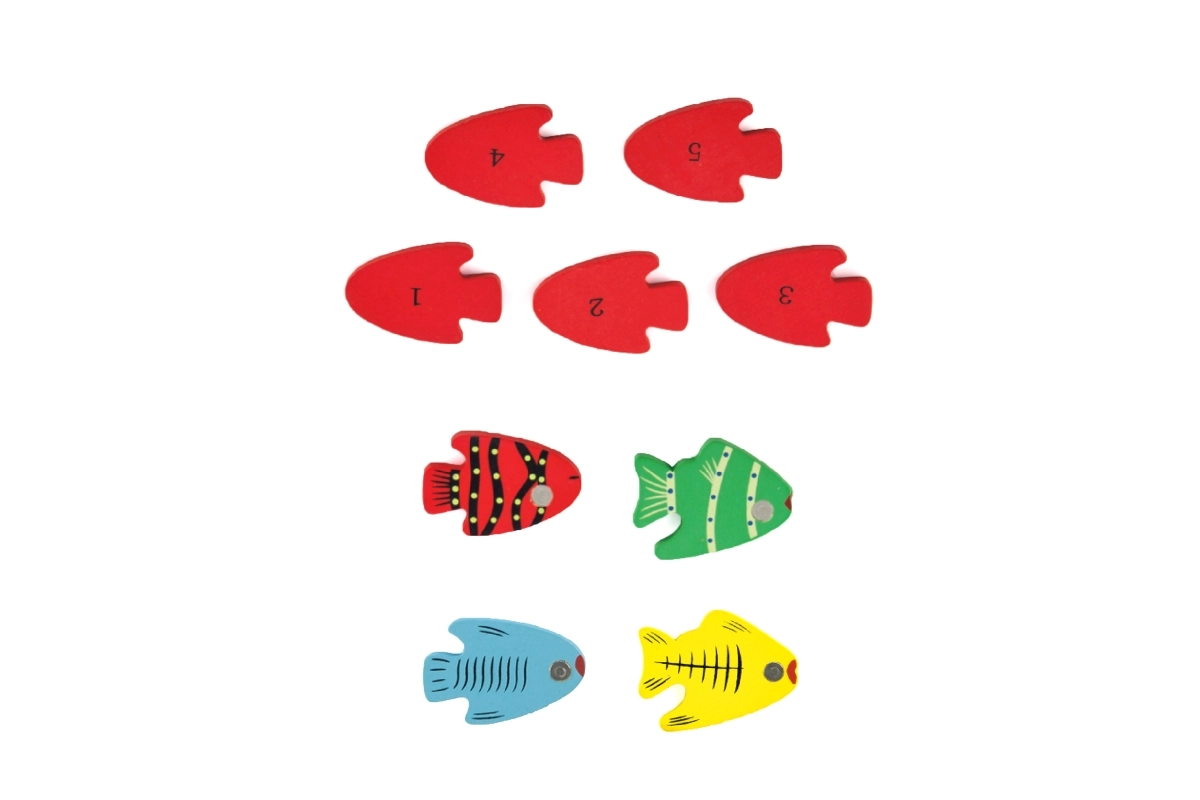 El set incluye una pileta de aproximadamente 35 × 13 × 5 cm, cuatro cañas magnéticas para jugar en grupo y 20 pececitos con números que fomentan la alfabetización matemática temprana y la clasificación. Gracias a las puntas magnéticas, pescar los pececitos es intuitivo y divertido.