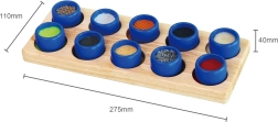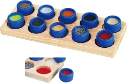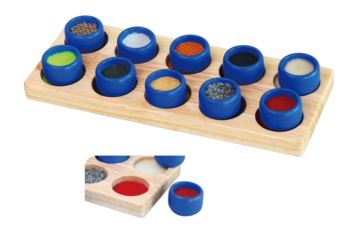 La tarea del niño es, según el sentido del tacto, encontrar la textura correspondiente y asignar el cilindro al orificio correcto, sin utilizar la vista. Así se entrenan los procesos táctiles, vestibulares y propioceptivos, fundamentales en la edad preescolar. La sólida fabricación en madera garantiza durabilidad y una larga vida útil.