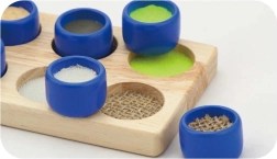 Los niños reconocen las superficies solo mediante el tacto y aprenden a asignarlas correctamente, fortaleciendo así la concentración y la sensibilidad sensorial.