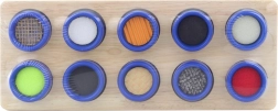 Este juego de clasificación táctil de madera combina los principios populares de los sorteadores con una estimulación sensorial más profunda. La base con diez orificios y el conjunto de diez cilindros con diferentes superficies y materiales fomentan la concentración, el razonamiento lógico y el desarrollo de la motricidad fina.