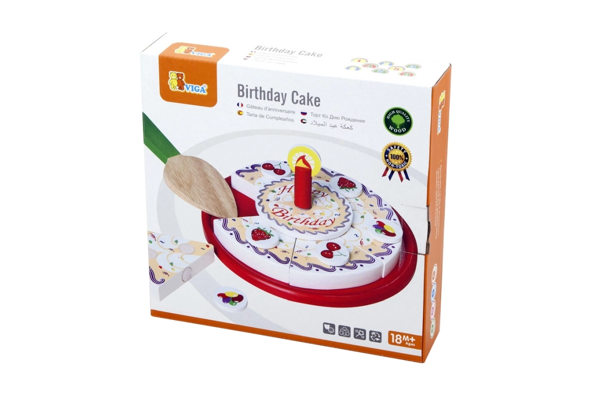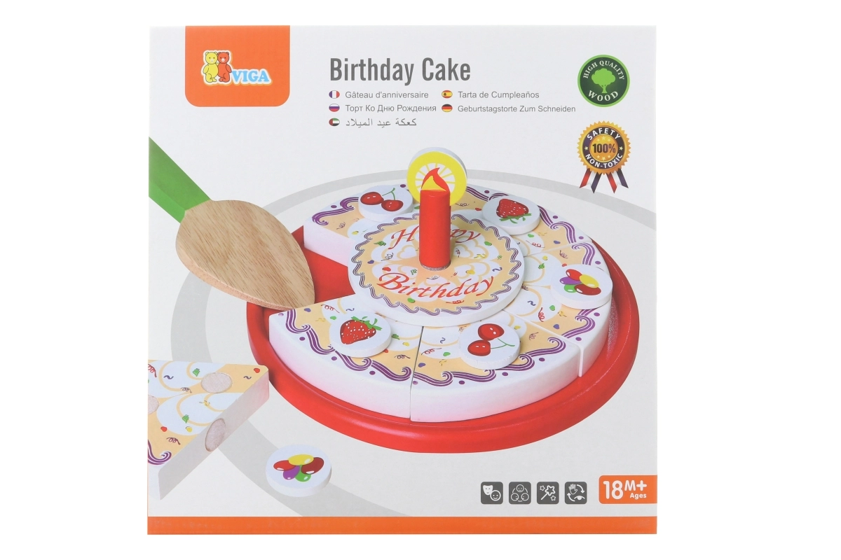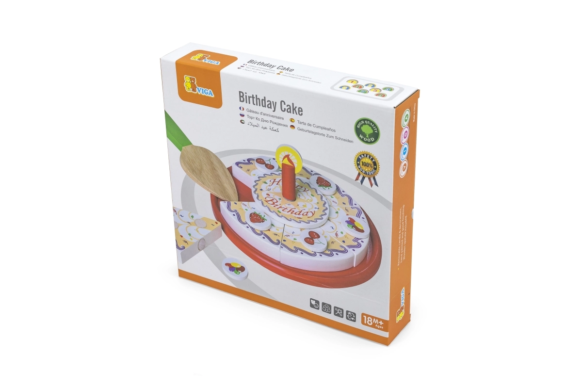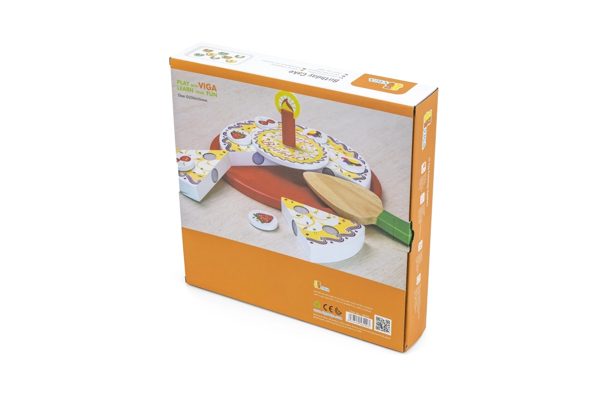 La elegante tarta de madera para cortar de la marca VIGA ofrece a los niños a partir de 18 meses horas de juego imaginativo. Las piezas de colores se “cortan” y vuelven a unir fácilmente, desarrollando la motricidad fina, la coordinación mano‑ojo y la colaboración durante el juego de la fiesta de cumpleaños.