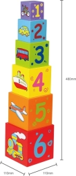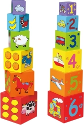 Cada cara del bloque está decorada con distintos motivos, como animales, números, frutas y medios de transporte, que enriquecen la imaginación infantil.