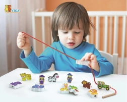 El set incluye coloridos bloques de madera y un cordón, que enseñan a los niños destreza y paciencia a través del enhebrado.