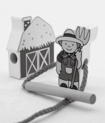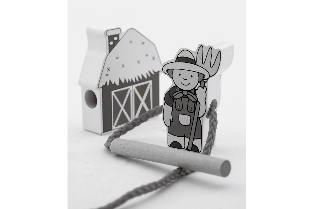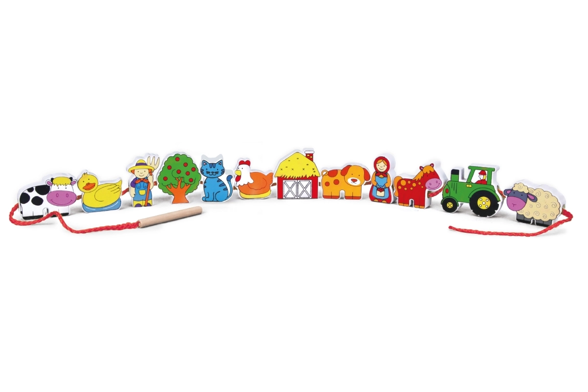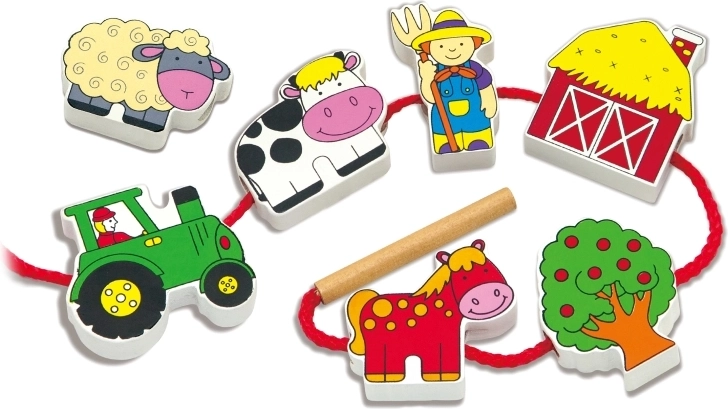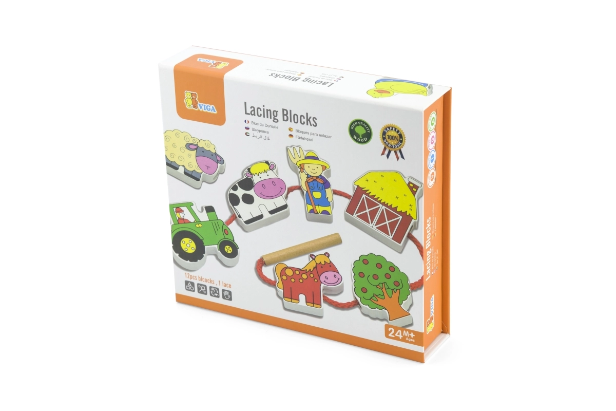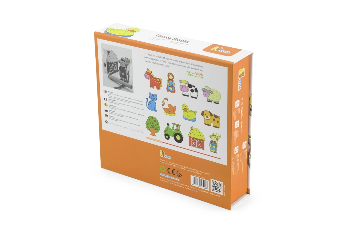 Los Bloques de Enhebrar de Madera con Temática de Granja VIGA están diseñados para cautivar a cualquier niño. Este set incluye 12 bloques de colores con motivos de granja que tu pequeño puede enhebrar fácilmente con el cordón incluido. Hay diferentes formas, como vaca, pato, gato, gallina, perro, caballo, oveja, granjero y su esposa, tractor, granero y manzano.