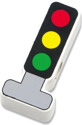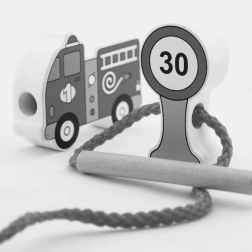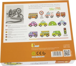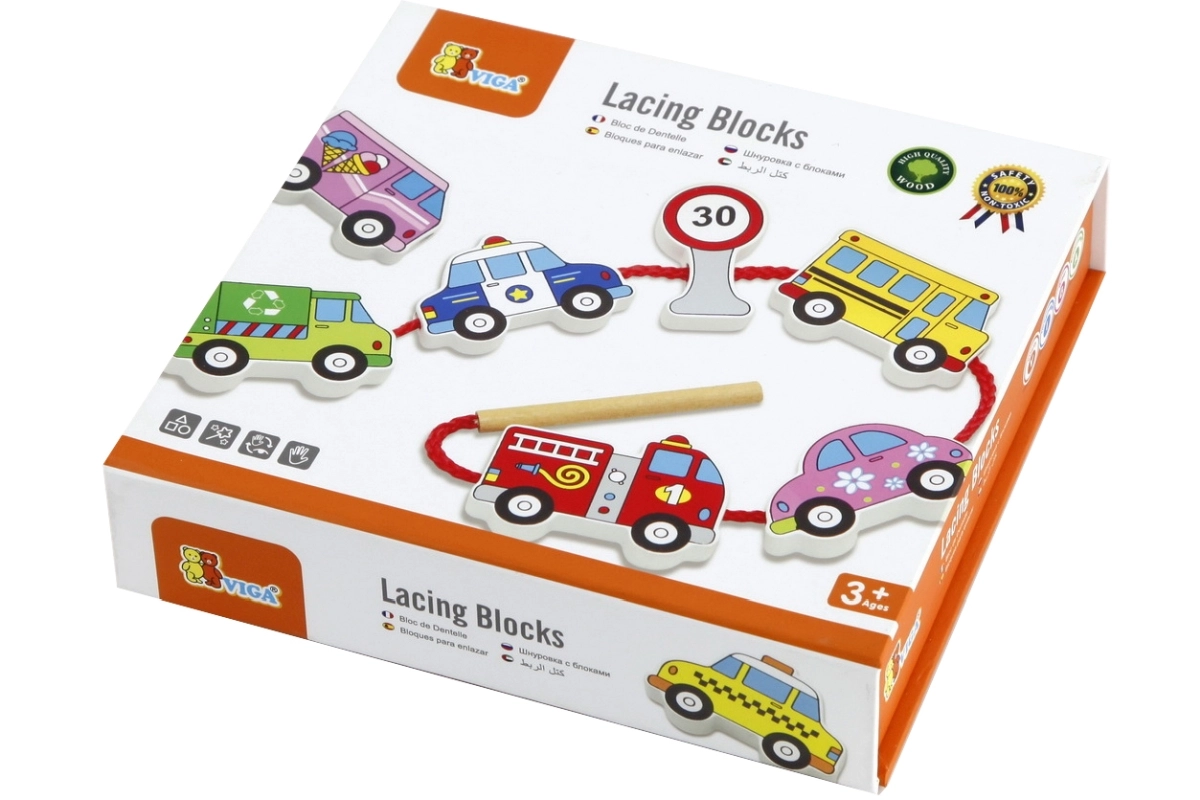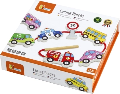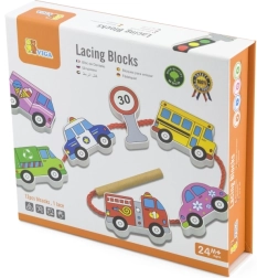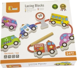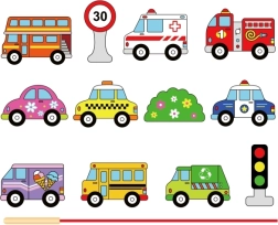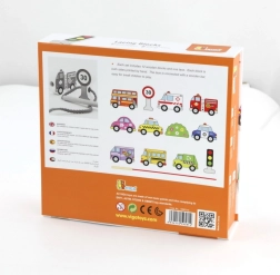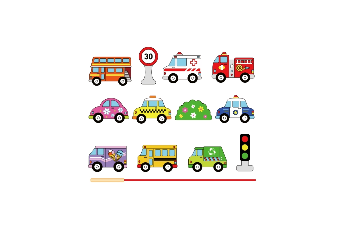 12 piezas y un cordón con varilla de madera permiten ensartar, ordenar y crear historias sobre el tráfico urbano.