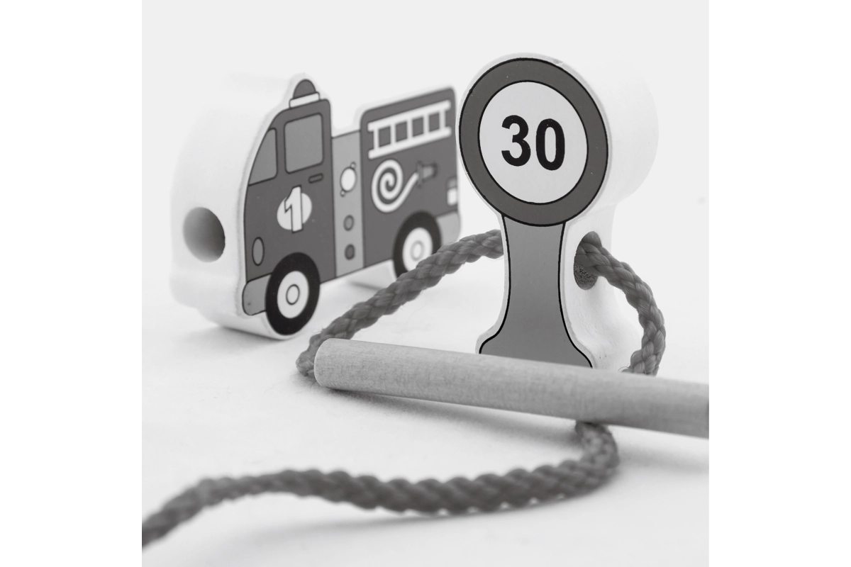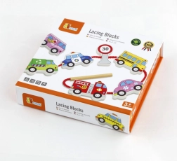Los niños reconocerán a los bomberos, la policía, el autobús y el taxi, y al ensartar entrenarán los dedos, la concentración y la coordinación mano-ojo.