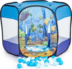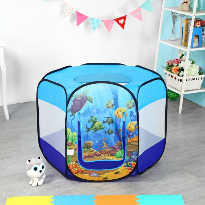 Una carpa emergente ligera y estable para niños con temática del mundo submarino convierte cualquier habitación o jardín en un divertido parque de juegos. Incluye 100 pelotas de colores, paredes de malla transpirables, entrada enrollable y ventana en el techo. La estructura auto desplegable garantiza un montaje rápido y fácil transporte.