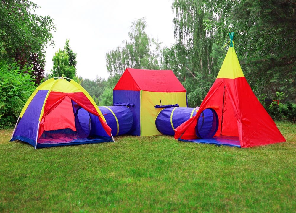 Las tiendas se montan con ligeros tubos de plástico y los túneles se despliegan solos. Sin herramientas, en pocos minutos, listo para diversión inmediata en casa o al aire libre.