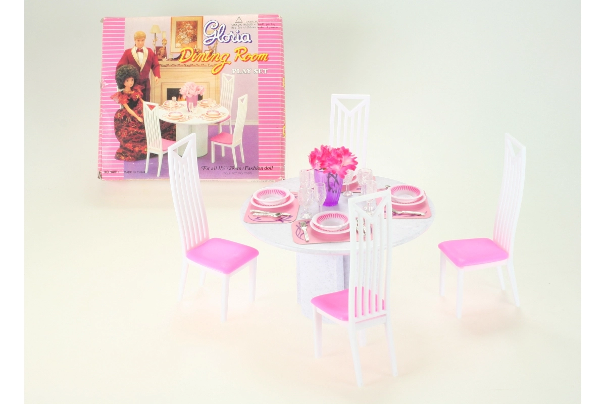 El elegante set de comedor para muñecas Glorie convierte cada juego infantil en un banquete realista. Incluye una mesa redonda, 4 sillas y 4 juegos completos de vajilla. Ideal para el juego creativo y el desarrollo de la imaginación de los niños a partir de 3 años.