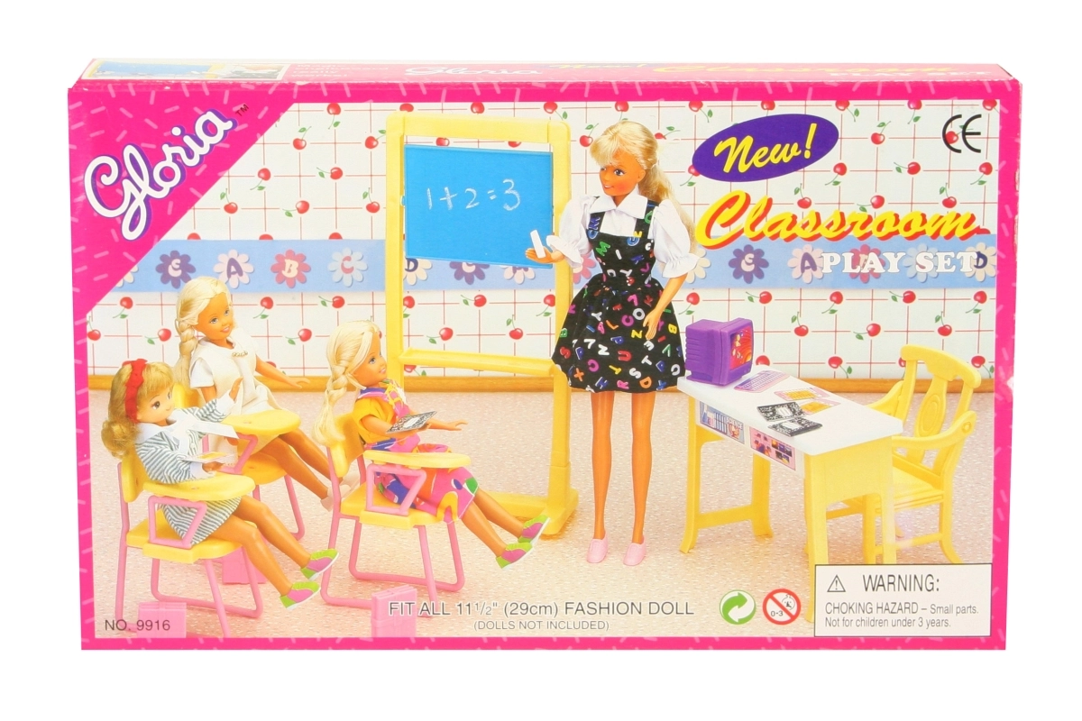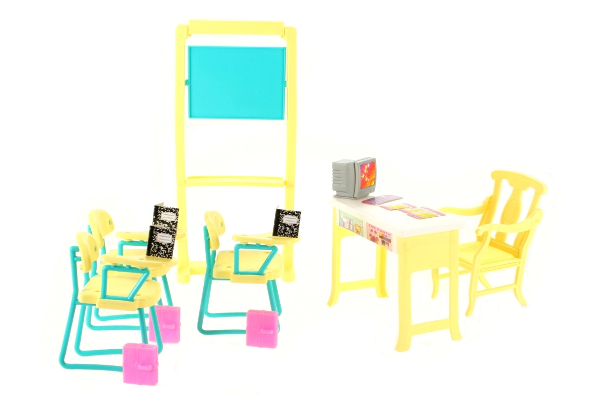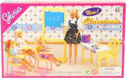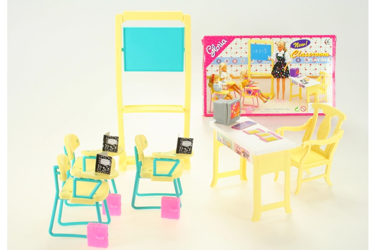 Crea en casa un ambiente escolar con el set Glorie aula escolar. Este conjunto ampliamente equipado incluye pizarra, mesa y silla de profesor, 3 sillas con reposabrazos, ordenador con teclado, mochilas y cuadernos y exámenes de papel. Ideal para el juego creativo y el desarrollo de la imaginación de los niños. Las muñecas no están incluidas.
