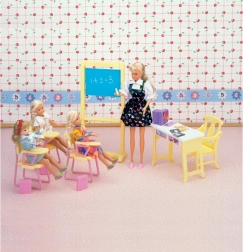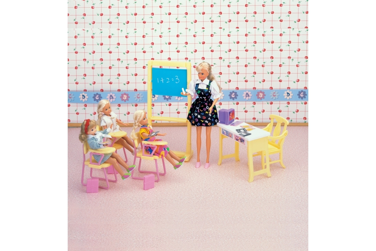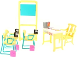 El paquete incluye una pizarra espaciosa, un rincón del profesor con ordenador y sillas para los alumnos. Gracias a sus dimensiones compactas, el set es compatible con muñecas estándar y se guarda fácilmente.