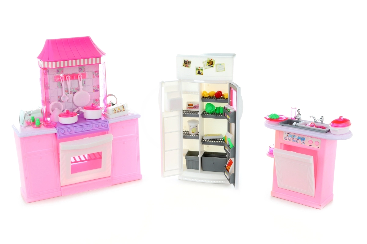 Ofrezca a los niños un juego doméstico realista con el set de cocina de lujo GLORIE, que incluye una encimera de cocina completa con horno, fregadero con lavavajillas y refrigerador con alimentos. También incluye un rico conjunto de accesorios de vajilla. La muñeca no está incluida. Apto para niños a partir de 3 años.