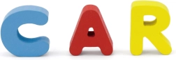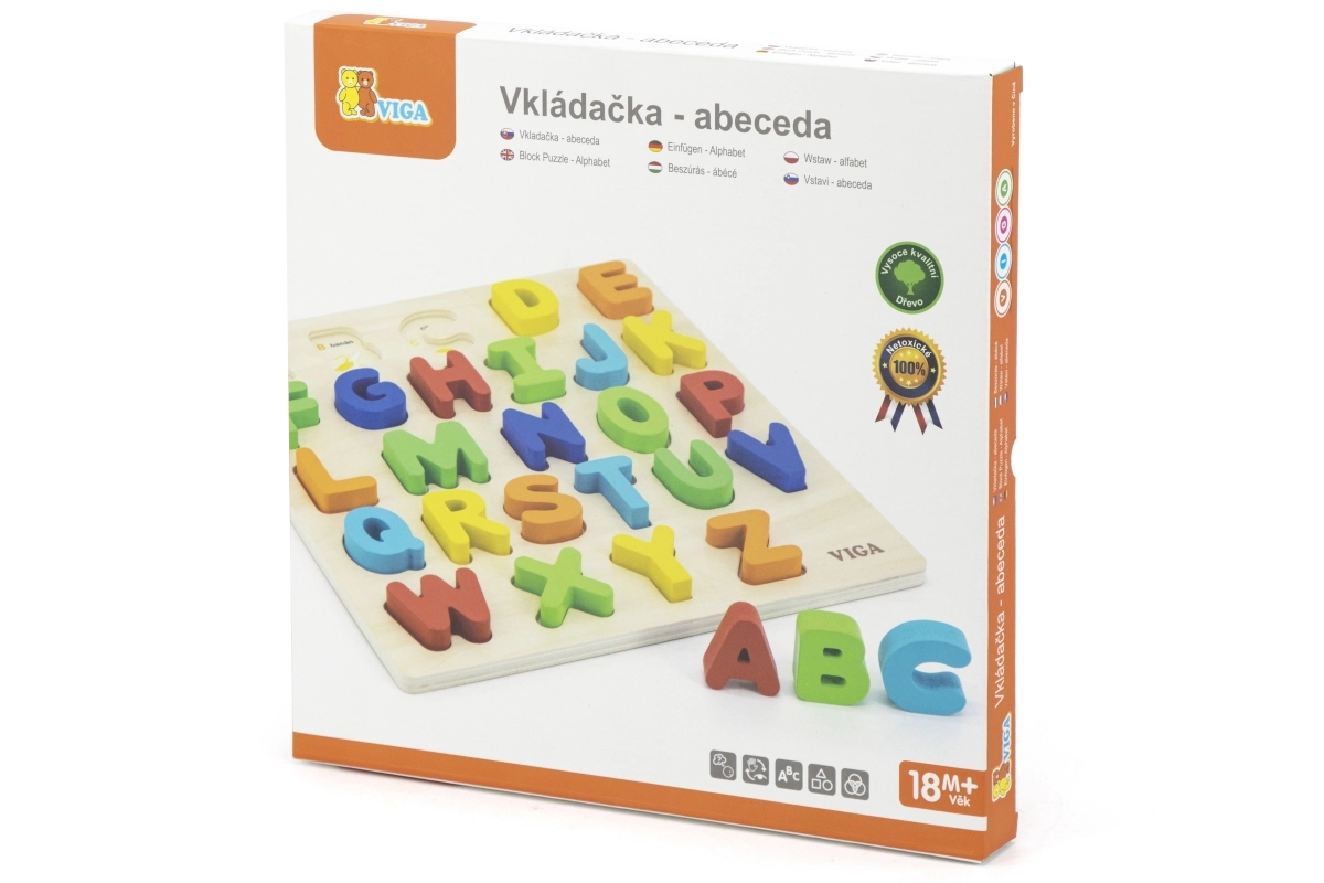 Rompecabezas de madera con letras del alfabeto checo, ideal para niños a partir de 18 meses. Este juguete fomenta el desarrollo de las habilidades motoras y el reconocimiento del alfabeto de forma divertida.