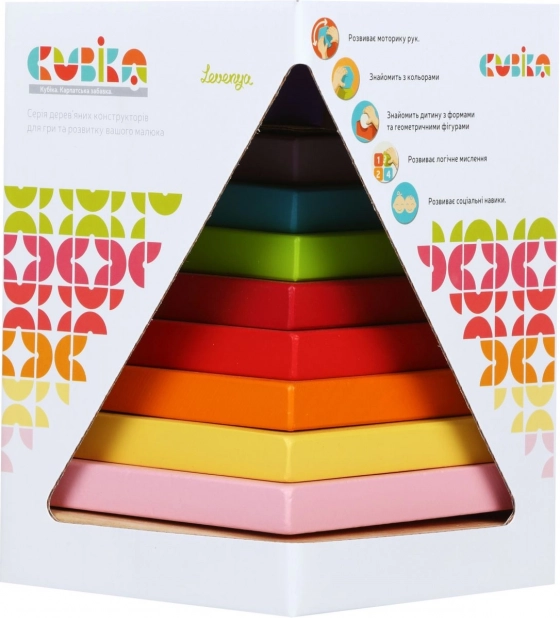 La marca Cubika ofrece juguetes de madera ecológicos con un acabado preciso y un diseño atractivo. La Pirámide de colores es un rompecabezas compuesto por 9 piezas que se pueden ensamblar en forma de pirámide. Este juguete no solo desarrolla de manera divertida las habilidades sensoriomotoras, sino también el pensamiento lógico y la creatividad.