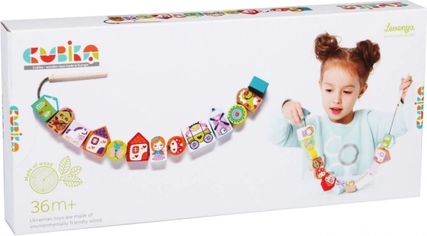 Cuento para ensartar CUBIKA es un set resistente y seguro, destinado a niños mayores de 3 años. Utiliza madera de cultivo ecológico y pinturas no tóxicas, garantizando seguridad y calidad. Este juego fomenta: