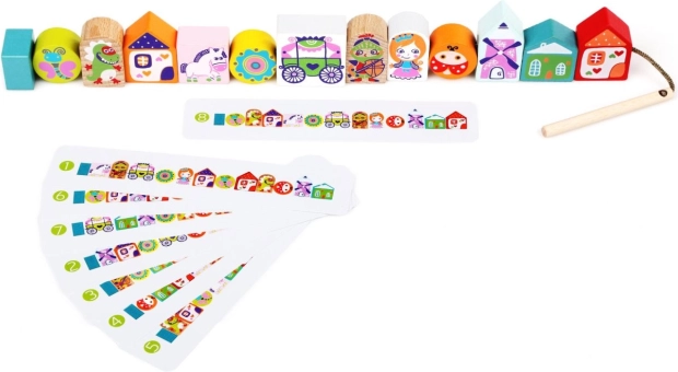 Incluye 13 piezas de madera con motivos de cuento para un ensartado divertido.
