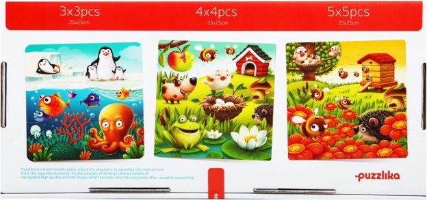 Descubre el aprendizaje a través del juego con el rompecabezas Puzzlika animales favoritos 3 en 1. El paquete incluye un total de 50 piezas grandes con las que los niños montarán 3 imágenes independientes de 25 × 25 cm con distintos niveles de dificultad (3×3, 4×4, 5×5). Gracias a los variados motivos de animales y a los colores llamativos, armar el puzzle es atractivo y motivador para niños en edad preescolar.