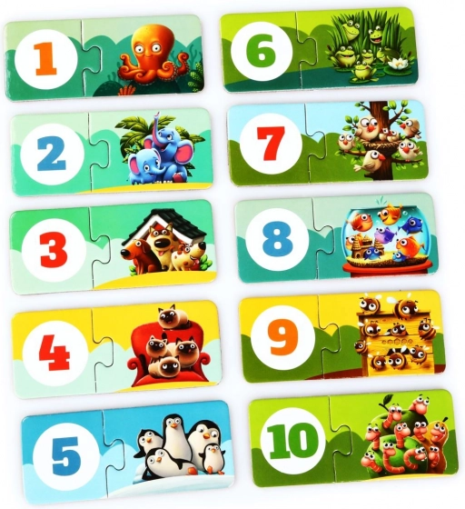 Divertido set educativo para los más pequeños: 20 piezas resistentes forman 10 parejas que los niños unen según el número de animales y las cifras del 1 al 10. El juego fomenta el pensamiento lógico, la motricidad fina y el reconocimiento de números, está hecho de cartón multicapa duradero y se limpia fácilmente pasando un paño húmedo.