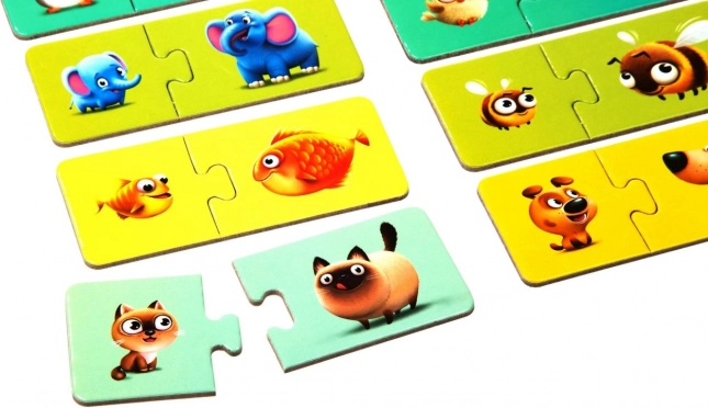 Puzzlika Mi familia es un rompecabezas inteligente y divertido para los más pequeños que ofrece aprendizaje activo a través del juego. Los niños unen parejas de tarjetas —crías y otros miembros de su familia— y desarrollan sus habilidades de reconocimiento, atención y emparejamiento correcto.