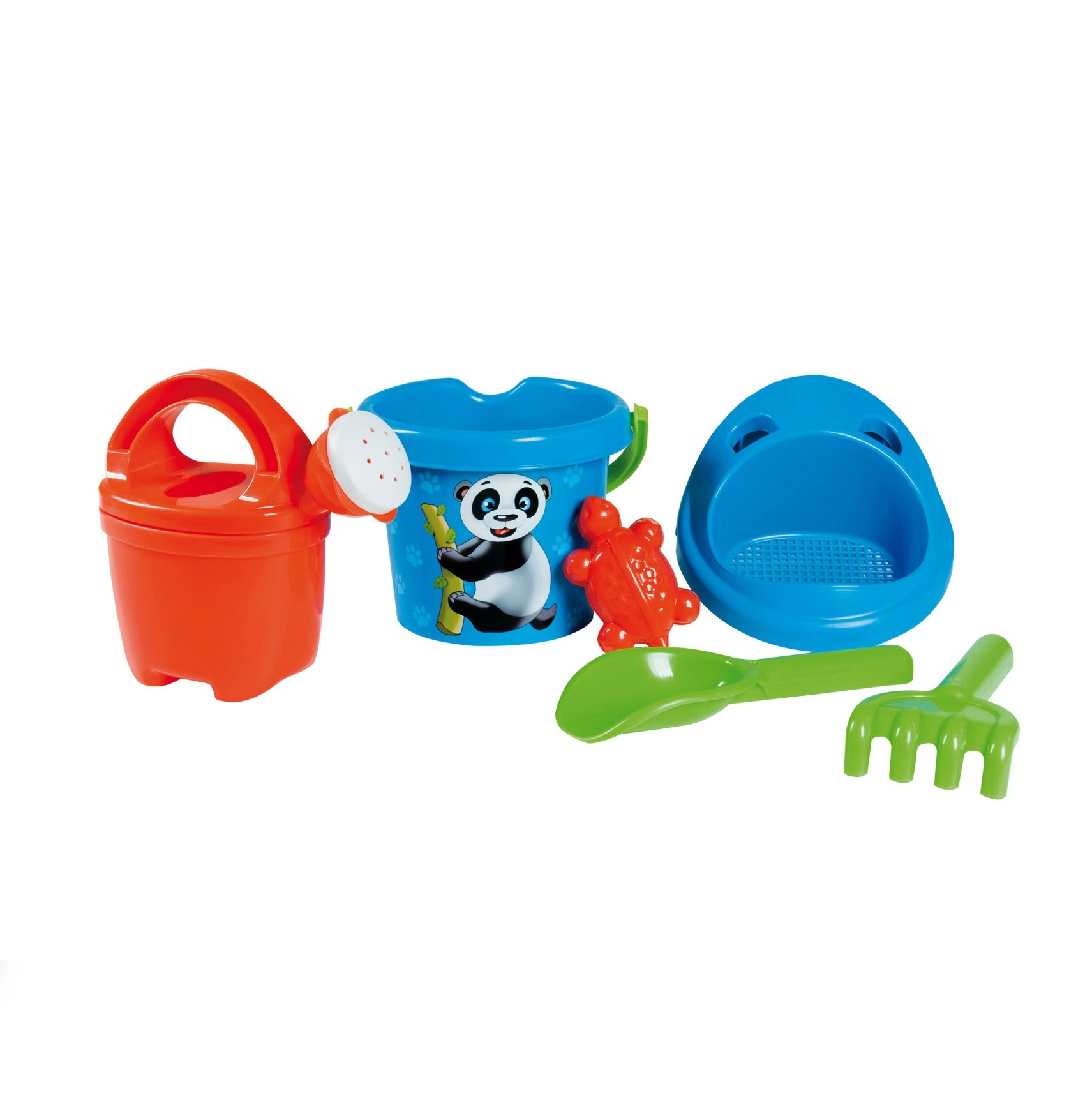 Adorable set de arena de 6 piezas ANDRONI con motivo de panda que alegrará a los pequeños constructores en la playa y en el arenero. Fabricado en Italia con plástico de alta calidad, es seguro desde los 12 meses e incluye todo lo necesario: cubo (Ø 13 cm, altura 11 cm), regadera de 0,5 l, tamiz, pala, rastrillo y molde con forma de tortuguita.