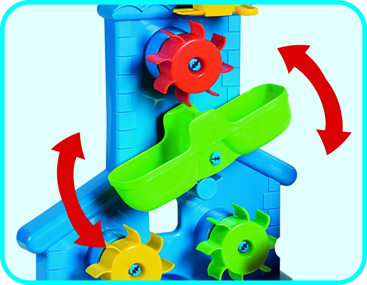 La compuerta móvil bajo la tolva permite a los niños regular el tamaño de la abertura y, por tanto, la intensidad del flujo. El juguete está fabricado en Italia con plásticos de alta calidad y con énfasis en la seguridad de los más pequeños.
