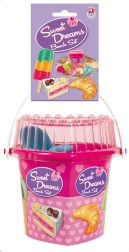 - Cubo en forma de corazón con tapa, pala, rastrillo, 4 moldes (helado suave, polo, tarta enrejada, croissant)