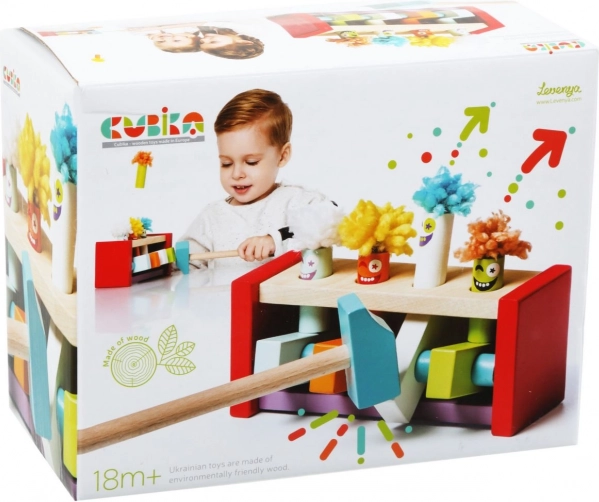 Banco de martillar de madera con payasos saltarines de la marca CUBIKA que convierte el juego en un aprendizaje divertido. Los niños golpean con el martillo los elementos de colores y observan cómo los payasos saltan: desarrolla de forma excelente la motricidad fina, la coordinación mano-ojo y el pensamiento lógico. Fabricado en arce y haya, con pinturas al agua seguras y producción europea.