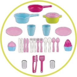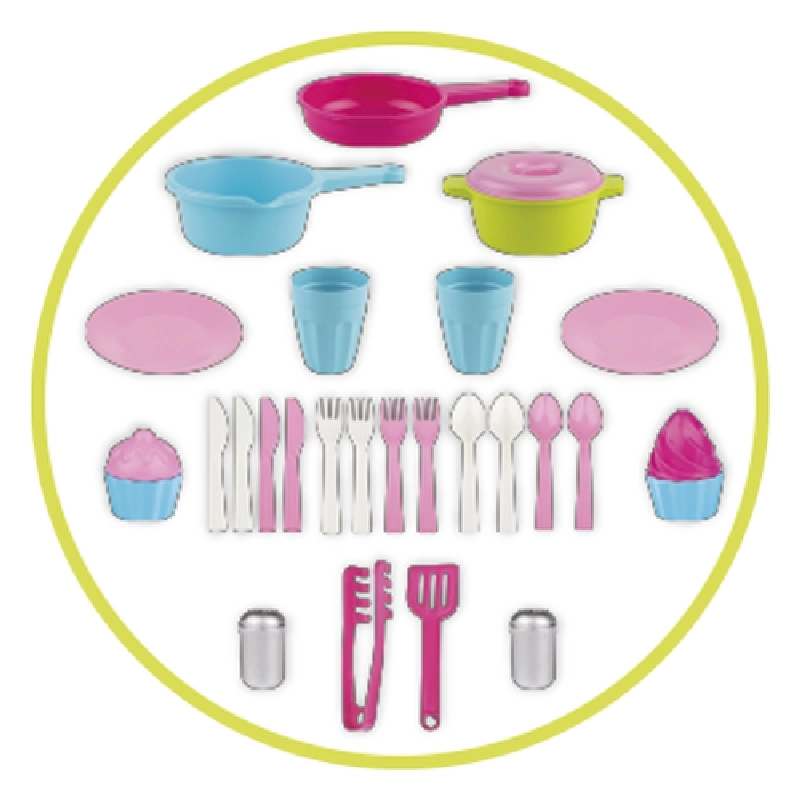 - Contenido del paquete: juego de cubiertos para 4 niños, cajón para cubiertos, horno con bandeja, placa de cocción, fregadero con grifo, 3 ollas, 2 vasos, 2 platos, 2 pinzas, salero, pimentero y 2 cupcakes