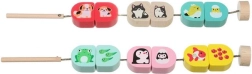 Ensartar las piezas de madera es más fácil gracias al pincho en la cuerda. Los niños practican el agarre, la precisión y la paciencia al formar parejas de animales.