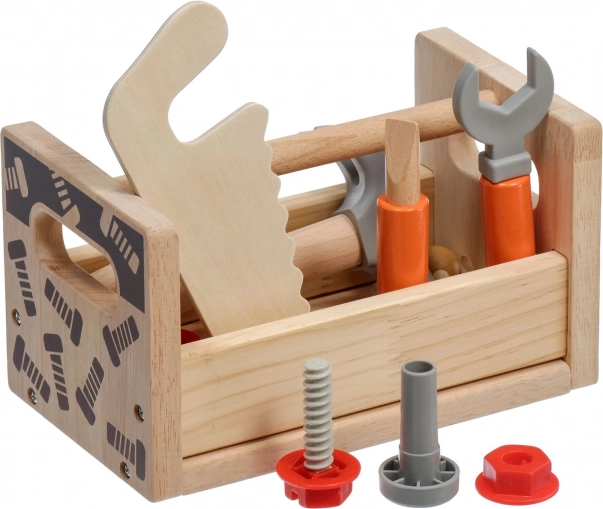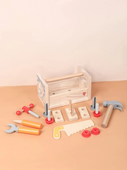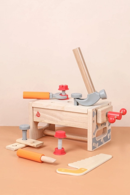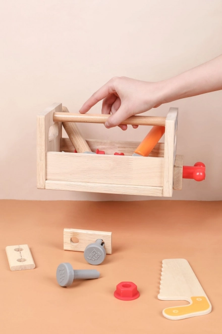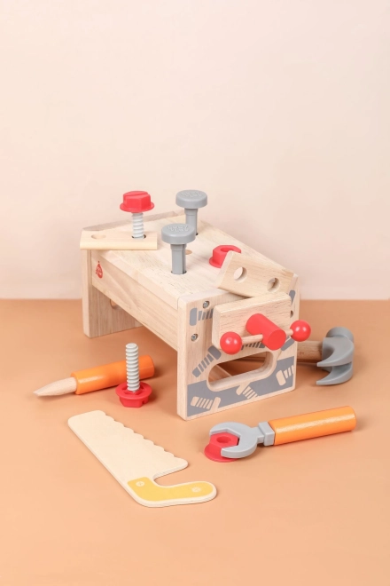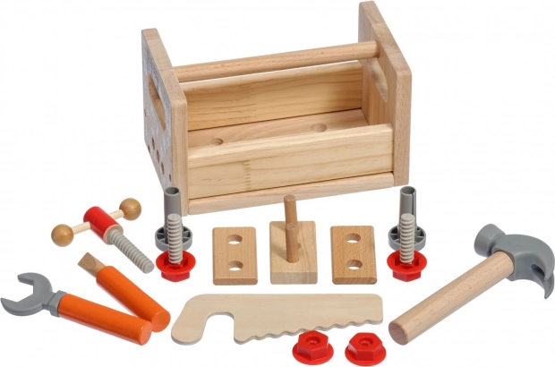 El set incluye una variada selección de herramientas infantiles: martillo, sierra, destornillador, llave, tornillos y tuercas, tornillo de banco y piezas de madera lisas con orificios. Todo tiene su lugar, de modo que los niños aprenden orden y las técnicas básicas de trabajo con elementos de fijación. El juego fomenta las construcciones creativas, la coordinación ojo–mano y la paciencia.
