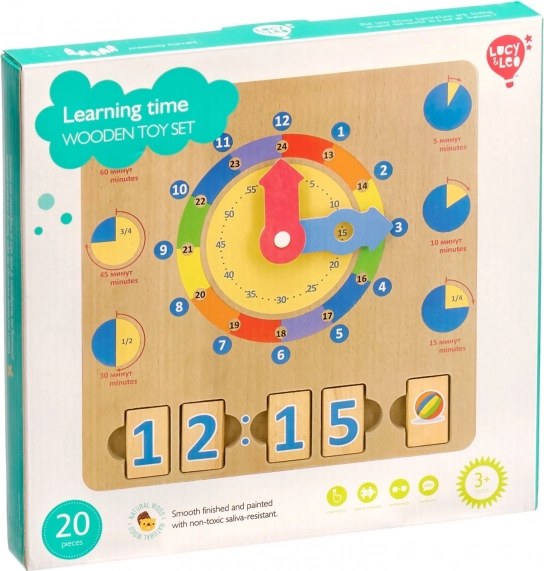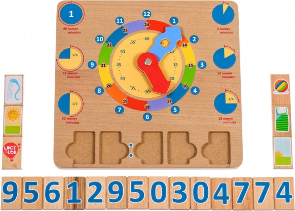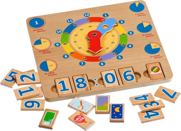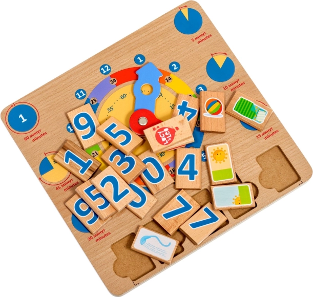 Incluye 14 bloques numéricos y 6 bloques con imágenes de actividades diarias. Cuatro bloques de tiempo pueden insertarse en las ranuras preparadas para crear la hora digital, mientras que el quinto bloque representa la actividad correspondiente. Así, los niños conectan visualmente el reloj analógico con la notación digital y la rutina diaria.