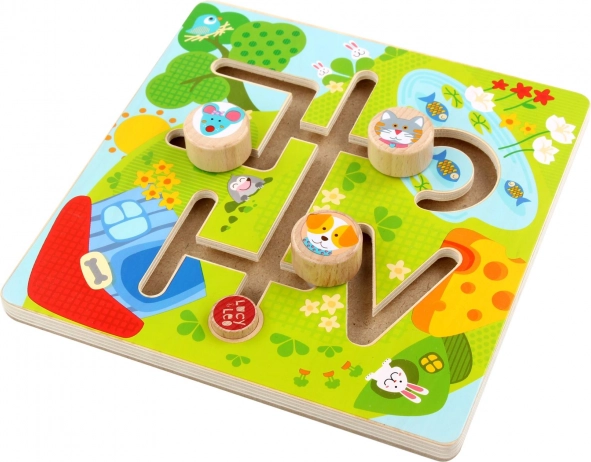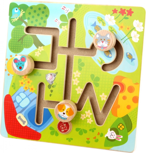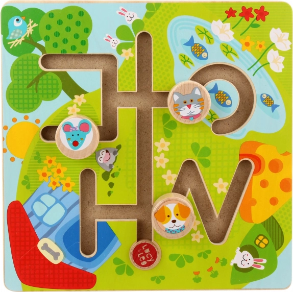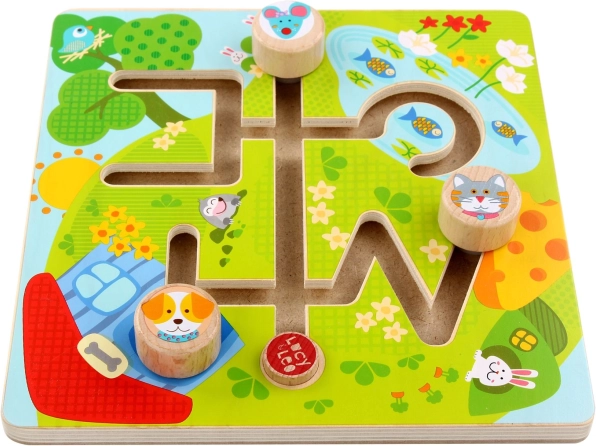 El laberinto de madera Valle Soleado aporta a los niños la alegría de descubrir y aprender. El tablero ilustrado con estanque y zona verde atrae a los pequeños al juego, donde el perro, el gato y el ratón avanzan hacia sus objetivos. Gracias a las ranuras fluidas, las figuritas se desplazan con facilidad y el juego resulta seguro e intuitivo.