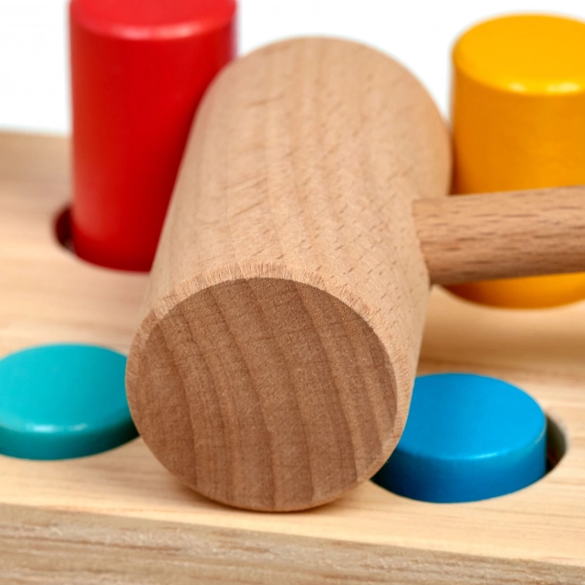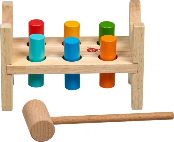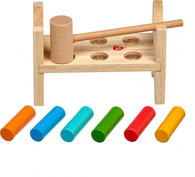 Seis clavijas de colores y un martillo de madera enseñan a los niños el agarre preciso, la fuerza del golpe y la coordinación ojo-mano.