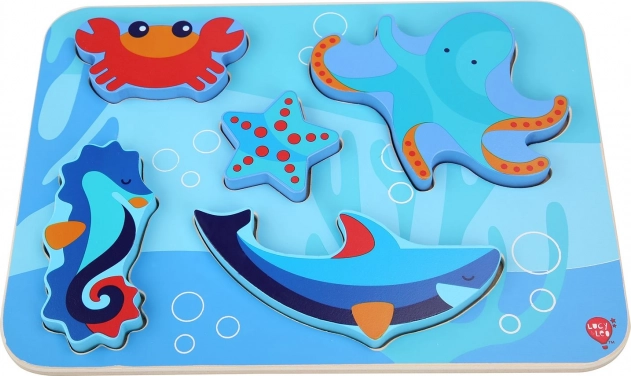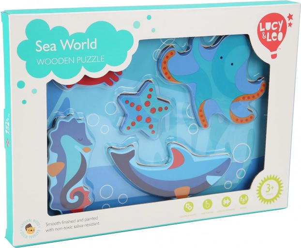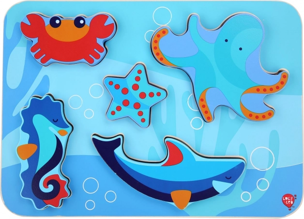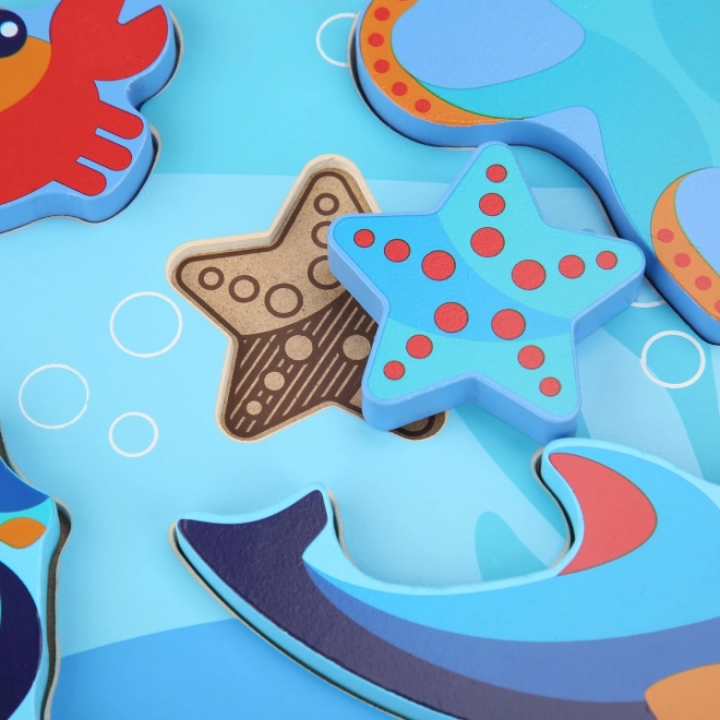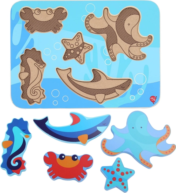 El rompecabezas infantil de madera con temática de animales marinos está diseñado para un aprendizaje divertido. Seis piezas de colores —por ejemplo, pulpo, estrella de mar o caballito de mar— encajan perfectamente en las formas fresadas de la base resistente con motivo oceánico. Las piezas son lo suficientemente grandes para sujetarlas bien y, gracias a su grosor, pueden mantenerse en pie por sí solas.