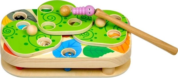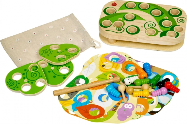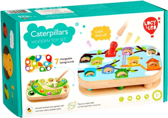 El divertido y educativo juego Lucy & Leo atrapando orugas desarrolla la motricidad fina, el pensamiento lógico y la coordinación mano-ojo. Con la ayuda de una varita magnética, los niños atrapan orugas de colores en los orificios del tablero de madera y prueban distintos niveles de dificultad con plantillas intercambiables y hojas giratorias.