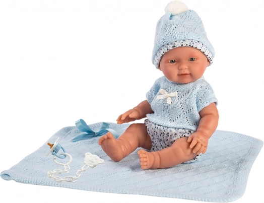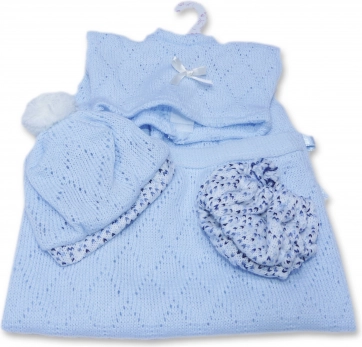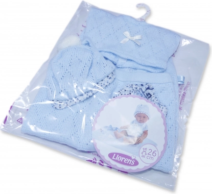 El conjunto para muñeca bebé de 26 cm incluye suéter, gorro y braguitas. Está diseñado para brindar la máxima comodidad y elegancia al juego con la muñeca. El paquete también contiene una mantita de punto suave que complementa el conjunto. Este set viene en un embalaje transparente con percha de plástico o cartón.