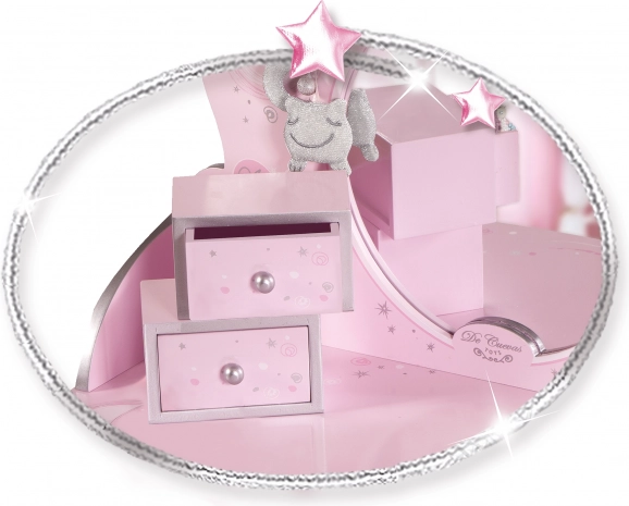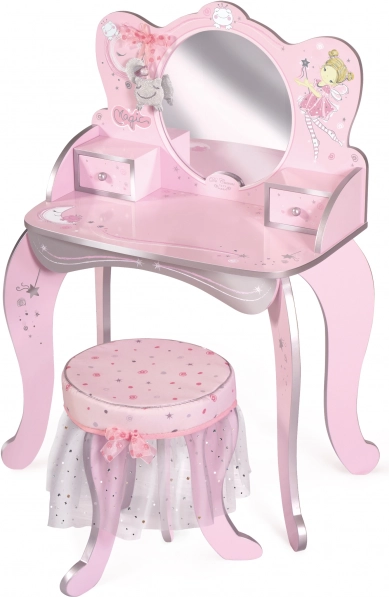 Este tocador de madera, inspirado en los cuentos, es el complemento ideal para cualquier dormitorio de niña. Está decorado con hermosos estampados e incluye