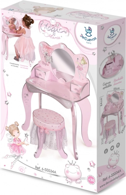 Ofrece dos cajoncitos para guardar accesorios y un espejo, lo que facilita el juego de disfrazarse.