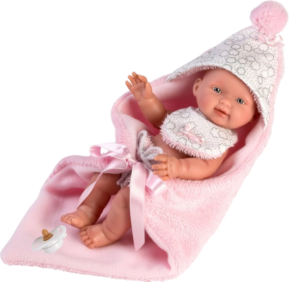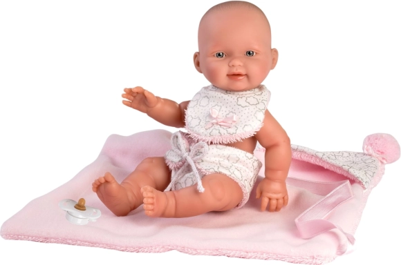 Este conjunto de dos piezas está diseñado especialmente para la muñeca bebé New Born de 26 cm. Incluye una mantita reversible con capucha que protege a la muñeca y le da el aspecto de un bebé real.