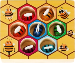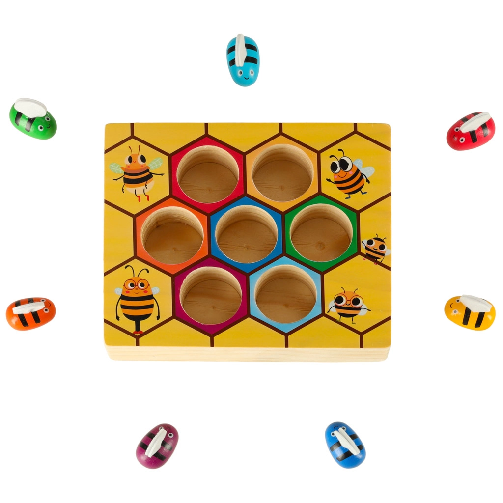 El juego educativo Panal de abejas Montessori fomenta el desarrollo de las habilidades motoras y la autonomía de los niños. Incluye una base de madera maciza y siete abejitas de colores que los niños colocan en los orificios correspondientes con la pinza de plástico roja incluida.