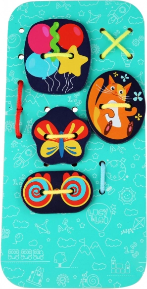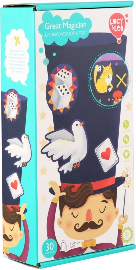 Descubra el creativo set de enhebrado de madera Lucy & Leo, que fomenta la motricidad fina, la creatividad y la diferenciación de colores y formas. El paquete incluye 31 piezas de madera, 4 cordones de colores y una gran base con un mago, en la que los niños pasan y fijan adornos según su imaginación.