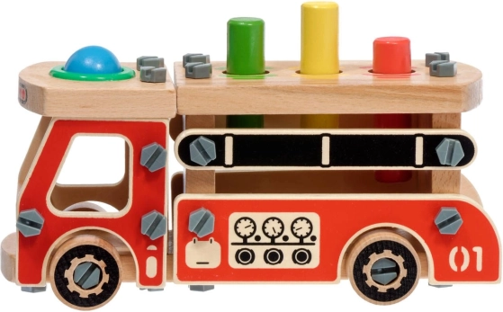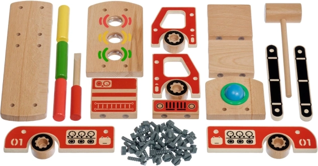 Este set creativo combina un kit de construcción y un banco de martillar en uno. Los niños primero ensamblan un robusto camión de bomberos de madera y luego, en su plataforma, usan cuatro orificios para martillar divertidos elementos de colores con el martillo. Gracias a los colores vivos y las variadas formas, el juguete favorece el aprendizaje natural y la concentración.