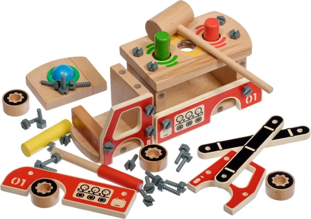 Ensamble un camión de bomberos de madera funcional con tornillos y herramientas. El proceso de construcción fomenta el pensamiento lógico y la paciencia.