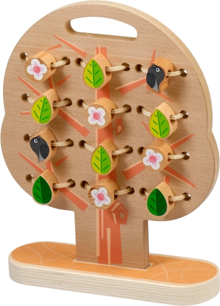 Este set de madera de calidad ofrece a los niños un juego entretenido de enhebrar y enlazar en una sólida placa con forma de árbol y soporte. Incluye piezas de colores (hojas, flores, bayas, bellotas, frutas, copos de nieve, insectos, etc.) y varios cordones para infinitas combinaciones. Tras el juego, las piezas pueden guardarse en la práctica bolsa de lino.